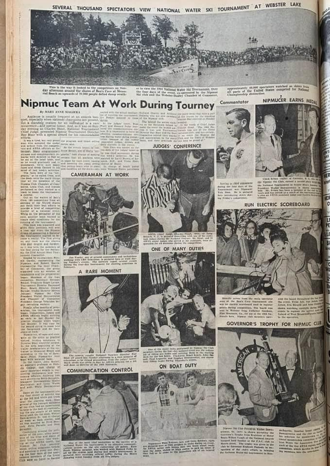 1963-1964: The club hosted the National Water Ski Tournament at Memorial Beach. Ron Cardin an Bob Harris were co-chairmen of the Host Committee. Ray Blair was Tournament Director. The town renamed Ben’s Cove to Nipmuc Cove in honor of the club.